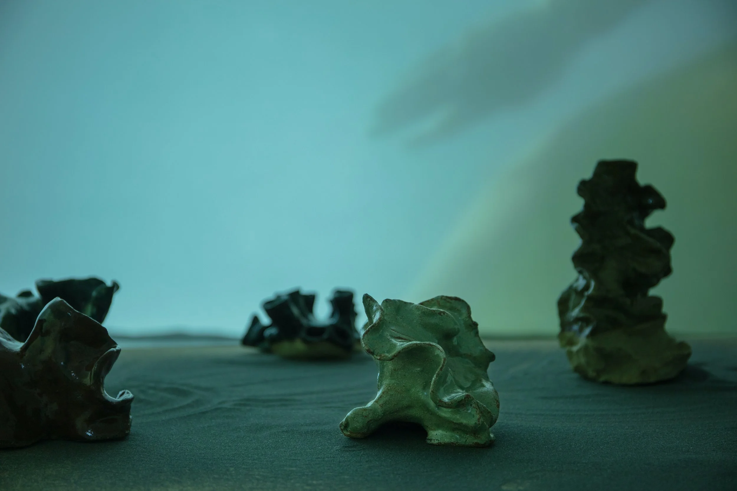 ‘Marine Lovers...their fishy beginnings’ is an exhibition and performance by Zoë Marden. Running from 24 September until 2 October in the project space at V.O Curations, the exhibition consists of a new two-channel film shot by Charlie Hope and Rosie Taylor, and a multimedia installation. Populated by a series of new ceramic ‘anemone’ sculptures, Marden’s installation echoes various forms of aquatic, alien creatures, and their surroundings, seen and felt elsewhere in the exhibition.